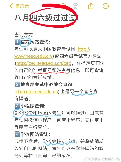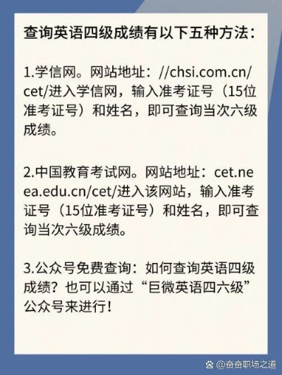 考试结束后,考生们可以通过多种方式查询自己的英语六级成绩,以下是一些常见的查询方式:
